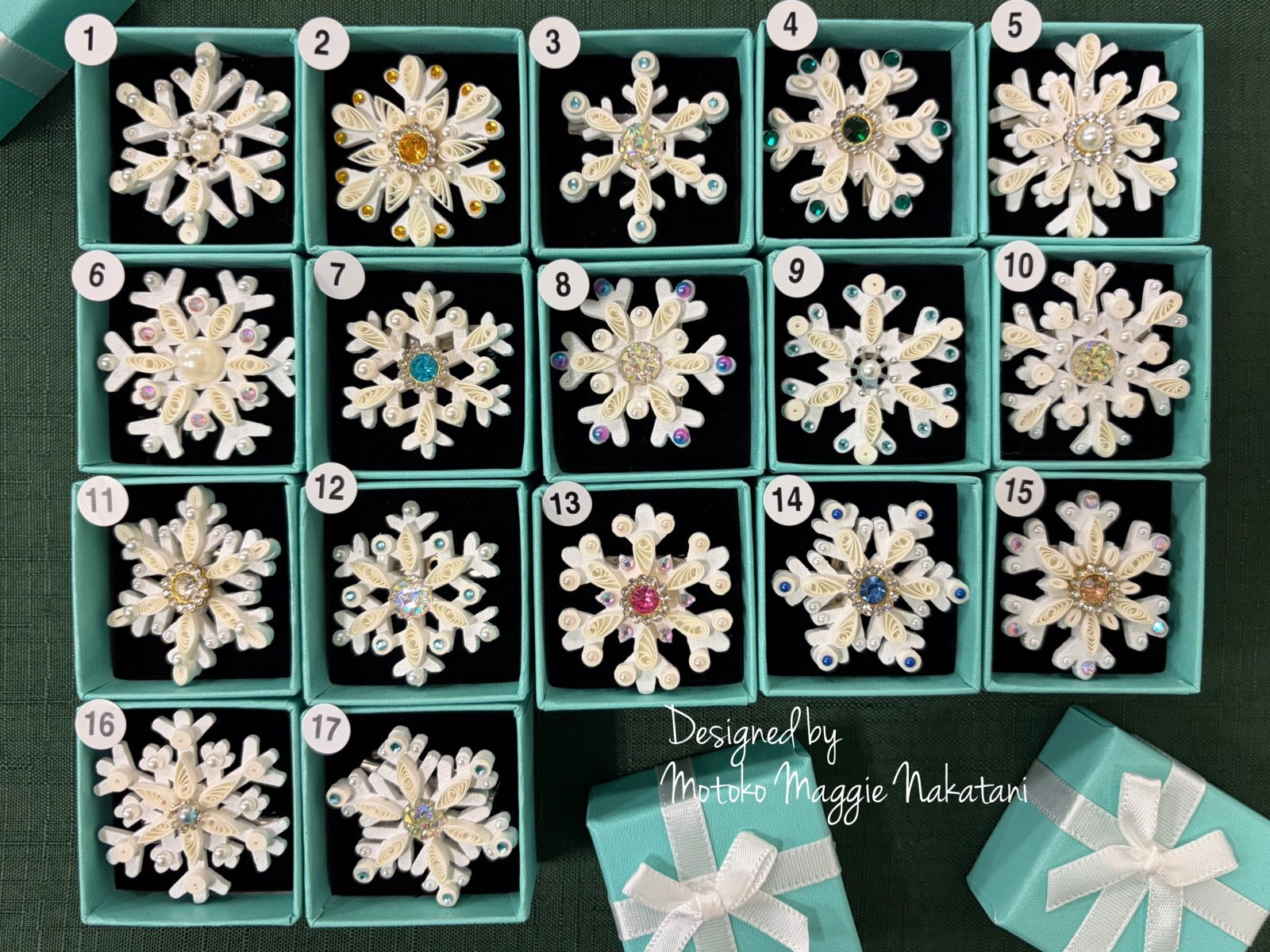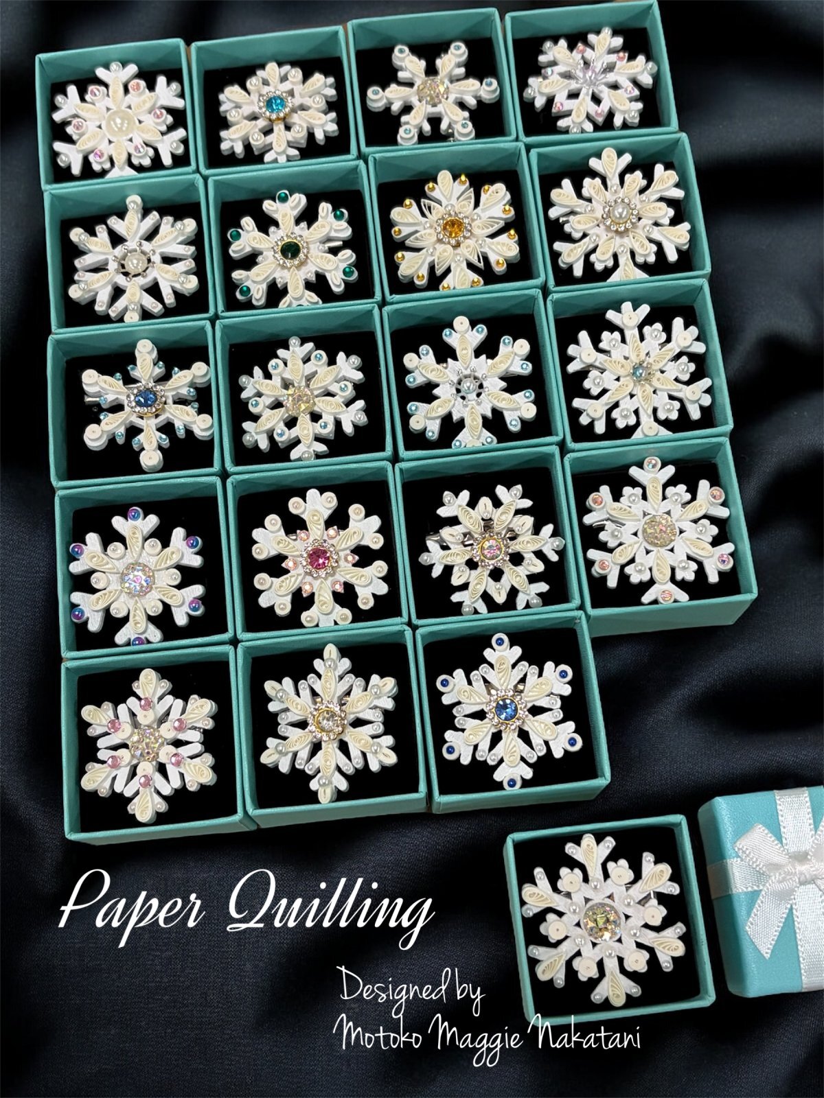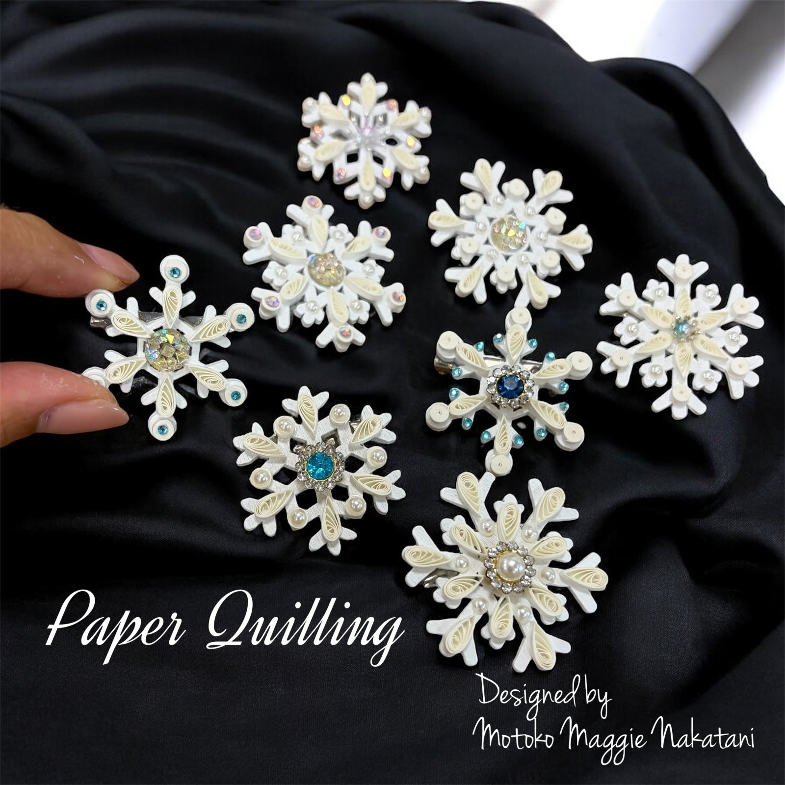 土台は木製3cm程度 そこへクイリングとキラキラで雪の結晶に仕上げました。
